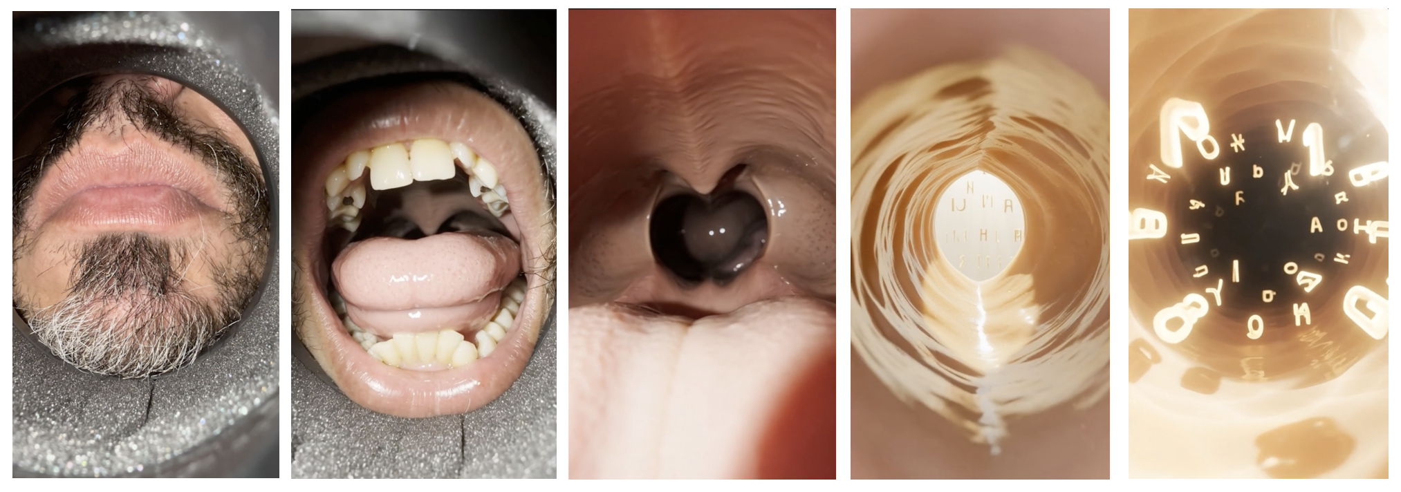 restricts at once, turning the mouth into a site where autonomy and constraint collide. What disappears physically becomes monumental digitally. The hidden mouth expands across the screen, revealed in overwhelming detail, and transformed into a landscape where language attempts to emerge. Air hits the lens, saliva flickers, and the usually invisible mechanics of utterance fill the image, producing a tension between exposure and obstruction. As the camera pushes closer, eventually revealing itself as an endoscope, the anatomical passage dissolves into an abstract terrain of shifting textures, letters, and algorithmic distortions. Subtitles slowly migrate into this interior world, merging with its forms and questioning where text ends, and body begins. |